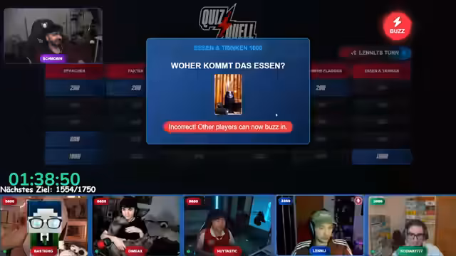 10:27:34Die Teilnehmer haben Schwierigkeiten mit der Kategorie Essen und Trinken. Eine Frage über die Herkunft von Kimchi führt zu einem falschen Tipp Südkorea, obwohl es sich um Kimchi handelt. Eine andere Frage nach einer deutschen Stadt anhand des Kennzeichens 'EA' wird falsch beantwortet, was zu Punktabzug führt. Anschließend wird die strategische Entscheidung getroffen, sich auf Bereiche wie Kennzeichen oder Fakten zu konzentrieren, in denen man stärker ist, um aufzuholen.