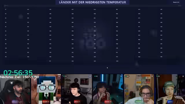 12:02:52Die Streamer diskutieren über die Geoguessr-Runde und die Ergebnisse, die sie überraschend finden. Sie äußern Verwirrung über die Einwohnerzahlen und die Platzierung von Städten, insbesondere die Liste der Millionenstädte, die ihnen unplausibel vorkommt. Die Teilnehmer widmen sich der Aufgabe, Länder anhand ihrer Durchschnittstemperatur einzuordnen, wobei sie über die Platzierungen von Städten wie Johannesburg, Madrid und Durban diskutieren und sich die richtige Einordnung der Liste klären.