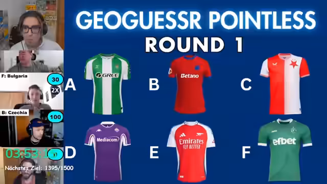 10:11:35Eine schwierige Geoguessr-Runde zeigt ein Bild, das ohne den Hinweis eines Pole keine klare Lösung zulässt. Die Teilnehmer diskutieren intensiv, ob es sich um ein Land in Südamerika oder um die Türkei handelt, und treffen schließlich die richtige Entscheidung. Anschließend soll eine Kennzeichen-Runde mit 'RI' gelöst werden. Nach längerem Überlegen, das verschiedene Länder wie Indonesien, Rumänien oder Irland in Betracht zieht, wird das Land als Armenien identifiziert.