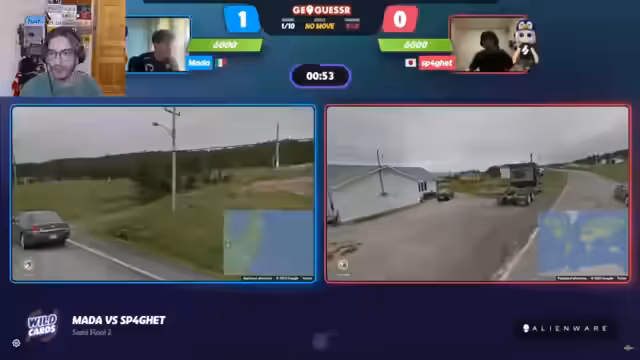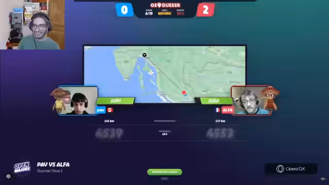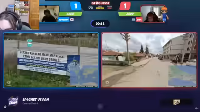 03:02:55Das Finale startet mit einer Runde in Griechenland. Clement überrascht mit sehr genauen Stadtkenntnissen und tippt sofort richtig. Spaghetti muss die Runde somit mit Schaden beenden. Danach folgt eine Runde in Japan, wo Spaghetti einen Fehler beim Schätzen der Küstenlinie macht. Trotzdem bleiben beide in der richtigen Region und liegen nur 250 Punkte auseinander. Das Finale beginnt mit einem klaren Vorteil für Clement.