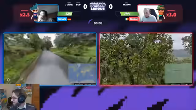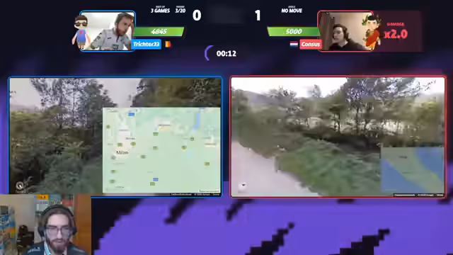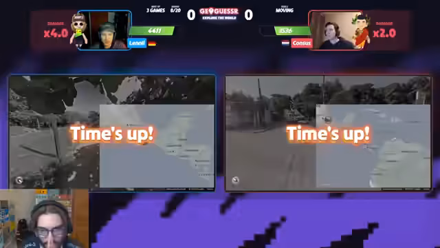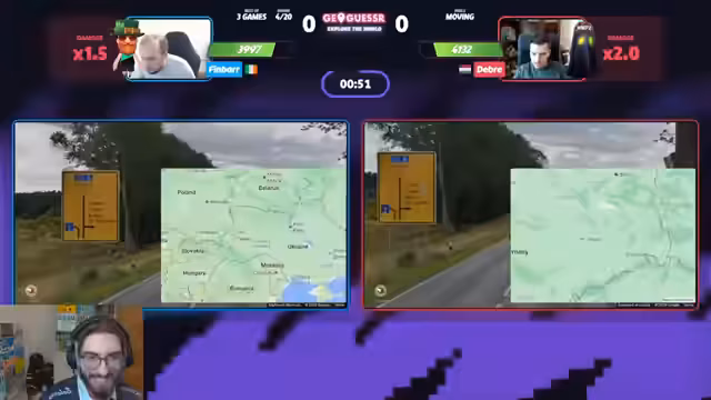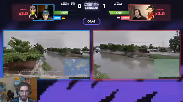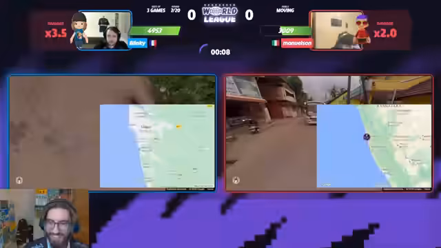 01:53:37Der Stream schaltet zu einem anderen Duell, Manuel gegen Steak, beide Legenden der Szene. Manuel gewinnt das Moving-Game schnell mit einem starken Guess auf Vancouver. In der folgenden Runde in Mexiko führt Manuel, verliert jedoch durch einen vermeintlich leichtfertigen Guess, was den Streamer als "Throw" bezeichnet. Das Match zeigt die extrem schnelle Spielweise beider Kontrahenten, bei der die Runden kürzer sind als die Pausen dazwischen.