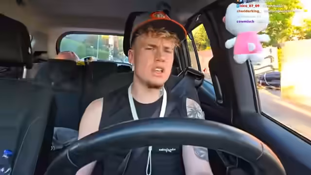 00:44:57Die Fahrt zum Gestaltungsstudio wird zu einem aufregenden Erlebnis. Der Streamer berichtet von einer beinahe-Kollision mit einem anderen Fahrzeug und einer Nervenkitzel situation im Straßenverkehr. Unterwegs wird er von Frauen im Auto erkannt, was ihm Aufmerksamkeit verschafft, aber auch zusätzlichen Stress verursacht. Nach diesem Vorfall ist er froh, sicher sein Ziel erreicht zu haben und kann sich nun ganz auf das Training konzentrieren.