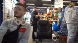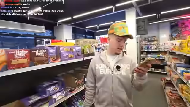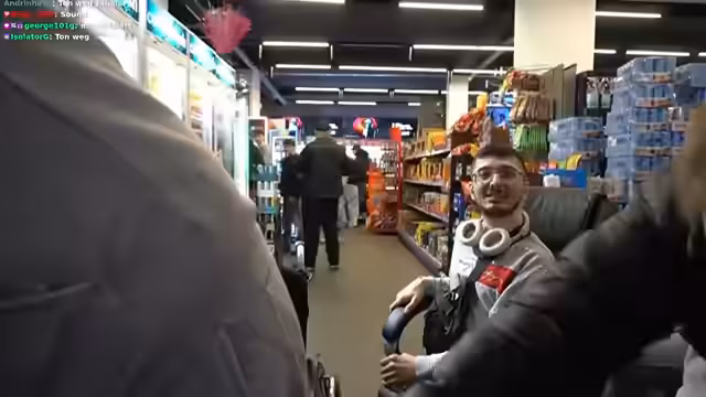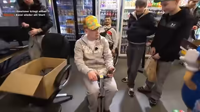 01:23:51Der Stream wandelt sich in eine Serie spaßiger, physischer Challenges. Dabei geht es zunächst darum, mit einem Rollstuhl einen sogenannten Wheelie zu machen, was nach mehrmaligem Versuch gelingt. Anschließend wird ein Wettrennen mit fahrenden Rollern durch die Gänge des Marktes veranstaltet. Der Gewinner erhält die Möglichkeit, sich im Laden Belohnungen auszusuchen, was die Interaktion mit der physischen Umgebung des Express-Marktes fördert und für unterhaltsame Momente sorgt.