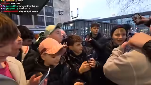 01:49:27Um dem anhaltenden technischen Problem mit dem PC-Stream zu entgehen, wird das Format zu einem IRL-Stream gewechselt, bei dem der Streamer und seine Gäste physisch im Express-Markt sind. Der Streamer geht zu den wartenden Zuschauern heraus, begrüßt sie namentlich und interagiert direkt mit ihnen. Er filmt die Anwesenheit, unterhält sich mit den Leuten und gibt Einblicke in die Atmosphäre des Events, was den persönlichen Charakter des Streams unterstreicht.