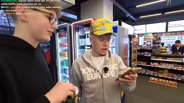 00:09:50Der Streamer holt Passanten in den Stream, um mit ihnen Challenges zu machen. Zuerst ist Mohamed zu Gast, der sich ein Getränk holen möchte. Später treten zwei 14-jährige Jungen, Max und Jakob, in den Vordergrund. Für die Zuschauer werden verschiedene Challenges angekündigt, darunter Dönerwettessen, Wettrennen mit einem fahrbaren Koffer, ein YouTube-Quiz, Sprite-Achsen-Challenge und eine Schnitzeljagd. Der Fokus liegt auf interaktiven und unterhaltsamen Elementen für die Stream-Zuschauer.