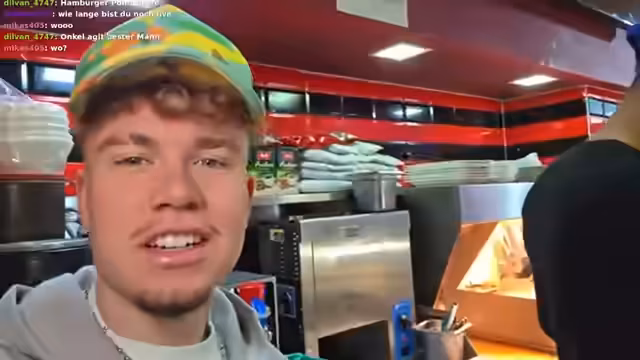 02:24:47Nach der Ankunft im Hamburger Point begrüßt der Streamer die Zuschauer und stellt den Dönerladen als traditionsreiches Familienunternehmen mit 40 Jahren Geschichte vor. Im Mittelpunkt steht die Zubereitung eines Döners, die im Detail gezeigt wird. Jonas erklärt die verschiedenen Fleischsorten, wie er ein Fladenbrot in einem Kontaktgrill vorbereitet und es knusprig macht. Anschließend zeigt er die Beilagen wie Kräuter, Knoblauchsoße, Tzatziki und Röstzwiebeln, die für den perfekten Geschmack sorgen, und demonstriert den schichtweisen Aufbau des Döners mit Fleisch, Gemüse und Soßen.