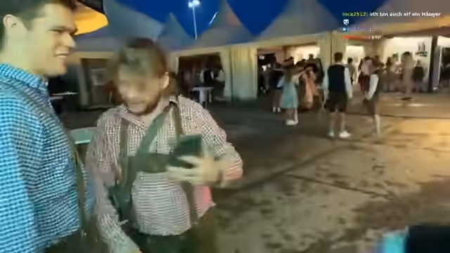 00:40:45Der Streamer hält sich weiterhin draußen an der Party auf und spricht mit verschiedenen Gruppen. Er trifft auf zwei Medizinstudentinnen, mit denen er sich über ihren Beruf und seine eigene Vergangenheit in sozialen Berufen unterhält. Er fordert die Frauen auf, an einem "Boxautomaten" teilzunehmen, wobei er verzweifelt nach einer 1-Euro-Münze sucht. Er nutzt die Gelegenheit, um spontane Interviews für ein geplantes Dokumentationsprojekt über das Oktoberfest zu machen.