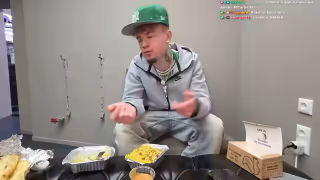 03:23:01Der Streamer berichtet von seiner Ankunft im Friseurladen, wo er von einem großen Mann namens Olek abgeholt und gebracht wurde. Die Stimmung ist entspannt, und er erklärt, dass er das Setup für den Stream verbessern und eine Raucherpause einlegen möchte. Er setzt sich erstmal hin, um etwas zu essen, und beginnt mit dem Unboxing seines Essens bestehend aus Pommes, Reis, Brot und Sauce. Die Salatbestellung scheint nicht bei der Lieferung angekommen zu sein, was aber für ihn kein Problem darstellt.