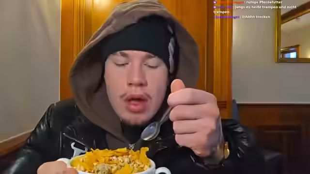 02:39:45Während des Streams trägt der Streamer seine neue Prada-Mütze. Er unterhält sich über geplante Aktivitäten und entscheidet sich spontan, etwas zu essen zu gehen, da ihm kalt ist und er Pizza wünscht. Der Streamer erwähnt, dass er zu viel gegessen hat und daher einen Verzehr von Fleisch ablehnt. Er schlägt Falafel mit Reis vor und bittet, Fleisch aus dem Essen zu entfernen. Getränk sei Sprudelwasser.