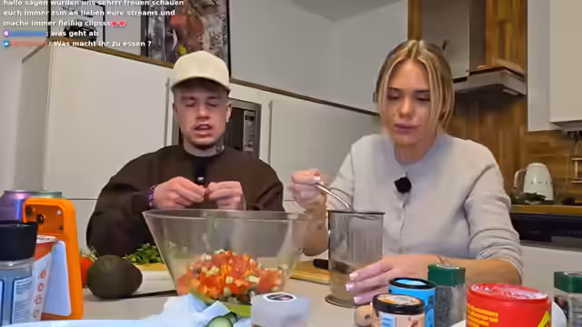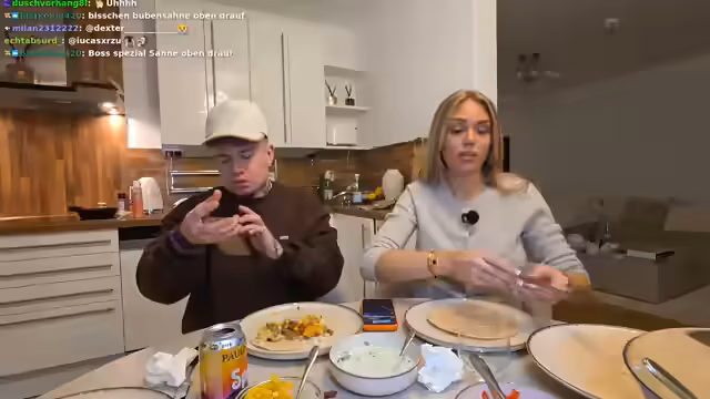02:31:26Die Streamer konzentrieren sich auf die Zubereitung des Essens. Es wird ein Joghurt-Dip im Stil von Tzatziki zubereitet, indem Joghurt, gewürfelte Gurke, Salz und Zitrone vermischt werden. Für die Wraps wird Hähnchen in der Pfanne gebraten, wobei besondere Aufmerksamkeit auf die richtige Temperatur und den Kruste gelegt wird. Das vegane Hähnchen wird ebenfalls zubereitet und mit Gewürzen wie Paprika und Rauchsalz abgeschmeckt.