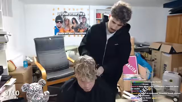01:48:50Es wird sich um eine Steckdose gekümmert, um das Handy aufzuladen. Es wird über ein Treffen in Frankfurt gesprochen, das nicht zustande kam. Es wird angekündigt, dass er sich im Livestream die Haare schneiden lassen wird. Lukas, der Friseur, ist am Start. Zuschauer werden aufgefordert, Fragen an Lukas und ihn zu stellen. Es wird die Kamera so eingestellt, dass beide zu sehen sind. Es wird über Fitness gesprochen. Er verabschiedet sich für morgen, da er früh arbeiten muss. Er macht die Kamera so, dass die beiden besser zu sehen sind.