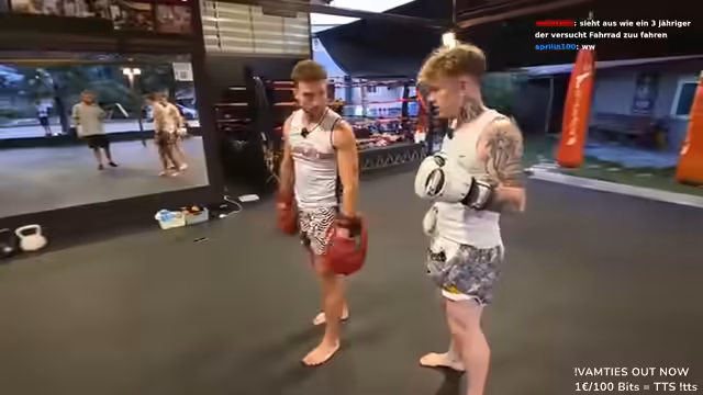 01:22:06Nachdem verschiedene Techniken wie Boxen, Kicken, Knie und Ellbogen geübt wurden, wird ein intensives Training mit 10 harten und schnellen Kicks durchgeführt. Anschließend wird das Clinch-Training vertieft, wobei der Streamer erklärt, wie man den Gegner im Muay Thai kontrolliert und Knie- oder Ellbogenstöße anbringt. Es wird auch die Verteidigung gegen den Clinch geübt. Nach einer kurzen Trinkpause wird eine Sparring-Session angekündigt, bei der ein weiterer Freund namens Giano, der ebenfalls am 2. Dezember kämpfen wird, teilnimmt. Es werden Schienbeinschoner und Handschuhe angezogen, und die Teilnehmer bereiten sich auf das Sparring vor.