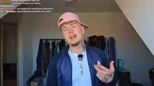 00:06:45Vor dem geplanten Auszug wird das aktuelle Outfit vorgestellt. Der Streamer trägt eine Peso-Tank, eine blaue Hose mit pinkem Detail, eine Burberry-Jacke, ein weißes T-Shirt, eine Chain und eine Gucci-Cap. Er erklärt, dass er gerne modisch auffällige Kleidung trägt, die ihn ausmacht. Dabei erwähnt er, dass er verschiedene Läden frequentiert, um seine Kleidung zu beziehen und sein Outfit als Teil seiner Markendarstellung sieht.