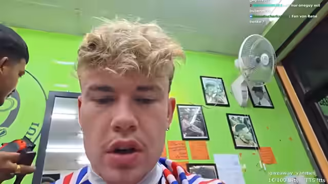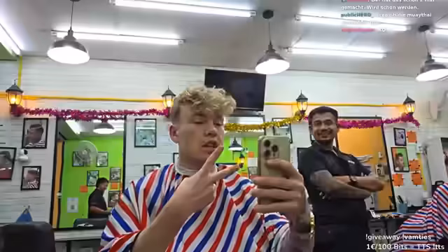 00:42:41Im Friseursalon angekommen, erklärt der Streamer dem Friseur, dass er seine Seiten auf Null geschnitten haben möchte (Skin Fade) und oben nur ein wenig gekürzt. Er stellt sich als Kony Gaboni aus Deutschland vor. Während des Haarschnitts erkundigt er sich bei den Friseuren nach Muay Thai. Er äußert den Wunsch, Muay Thai auszuprobieren, da er es noch nie gemacht hat. Die Friseure geben ihm Informationen über ein Muay Thai Camp in der Nähe, das nur 10 Minuten entfernt ist. Er überlegt, ob er einen Livestream oder ein YouTube-Video über seine Muay Thai Erfahrung machen könnte, was er als gute Content-Idee betrachtet. Er erfährt auch, dass man beim Muay Thai Ellbogen einsetzen darf, was zu Verletzungen führen kann.