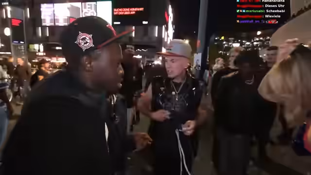 00:04:10Während die Streamer die Mikrofone einrichten, interagieren sie intensiv mit ihrem Chat. Sie zeigen verschiedene Kleidungsstücke und Accessoires wie eine Kette, die gegen das Mikrofon schlägt, und besprechen den technischen Aufwand. Gleichzeitig halten sie kleine Interviews mit Passanten auf der Straße, die zum Konzert unterwegs sind, und begrüßen bekannte Streamer wie Benji im Chat.