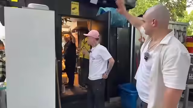 01:10:16Die Gruppe ist in einem Dönerladen namens Muka Kebab in Berlin Kreuzberg. Der Laden ist sehr stark frequentiert und der Streamer lobt das Essen enthusiastisch. Sie filmen im Inneren des Ladens und interagieren mit dem Besitzer Ali Jemmo, der sich als Ur-Kreuzberger vorstellt. Es gibt viele positive Reaktionen auf das Essen, das als besonders intensiv und lecker beschrieben wird.