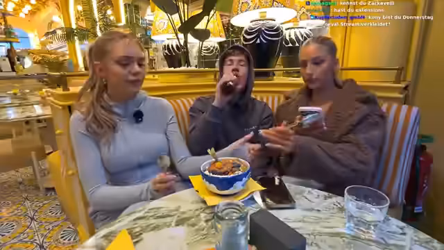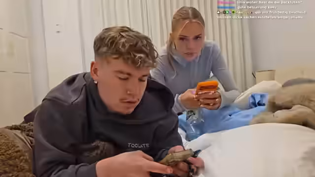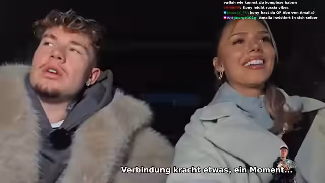 01:06:59Der Stream wechselnt von einem spontanen Aufenthalt nach draußen, wo Zuschauer auftauchen und Conny und Amalia um Selfies bitten. Ein junger Zuschauer behauptet, mit 15 Jahren selbst Geld zu verdienen, was eine Diskussion über das Alter und Einkommen auslöst. Conny und Amalia nehmen das Selfie auf und interagieren intensiv mit den Live-Zuschauern, auch werden Fragen zu Placements, Streaming-Zeiten und anderen Themen gestellt.