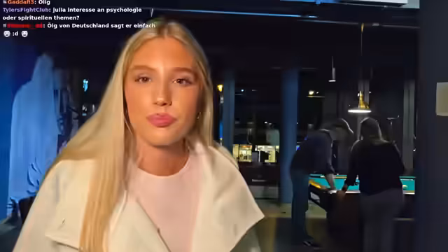 01:24:31Im oberen Stockwerk der Spielhalle wird ein Billardtisch gesichtet, der jedoch belegt ist. Die Streamer unterhalten sich über die Vor- und Nachteile von Beziehungen und Monogamie im Vergleich zu offenen Beziehungen. Es kommt zu gegenseitigen Neckereien, insbesondere zwischen den Streamern und Julia. Beim Verlassen der Halle halten sie beim Spaziergang Händchen und planen gemeinsame Aktivitäten wie einen Besuch im Phantasialand, was zu einem romantischen Moment führt.