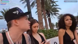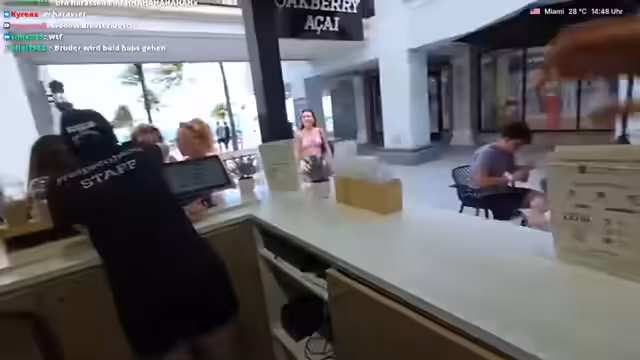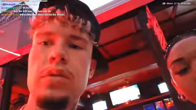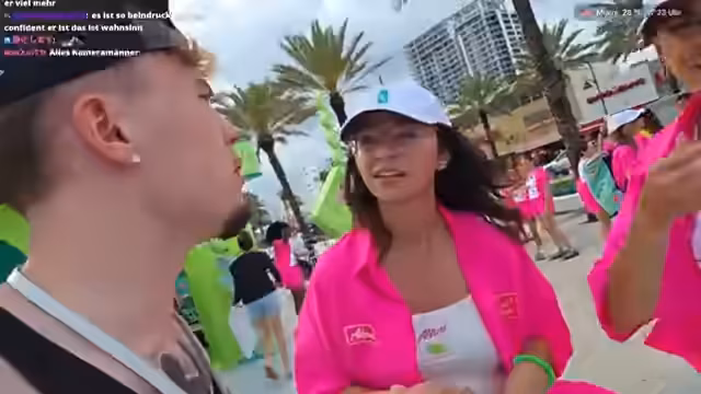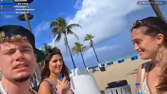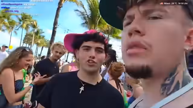 05:02:02Der Streamer trifft auf junge Leute und inszeniert kurz ein Kuss-Spiel. Er lernt Daniel kennen, der aus Deutschland stammt und bereits drei Wochen in Miami ist. Er erwähnt eine Frau und ihren möglicherweise getragenen 'Boyfriend-Shirt' und deutet an, sie später anzurufen, was auf das Fortsetzen persönlicher Kontakte nach dem Stream hindeutet.