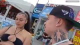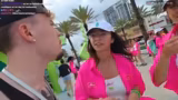 00:22:37Ein Teammitglied verteilt kostenlose Energy Slushies und bietet an, Fotos mit den Passanten zu machen. Der Streamer nutzt diese Gelegenheit, um mit den Menschen zu sprechen und Kontakte zu knüpfen. Er versucht, Nummern von Frauen zu bekommen und flirtet intensiv, was teilweise auf positive, teils auf ablehnende Reaktionen stößt.