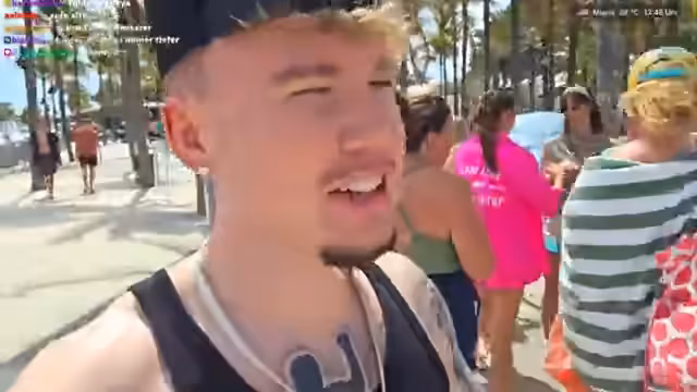 04:03:54Während des Ganges am Strand beginnt der Streamer zahlreiche Passanten anzusprechen und führt spontane Interviews. Themen sind Reisen, Herkunft und berufliche Tätigkeiten. Ein unerwartetes und dramatisches Ereignis ereignet sich, als eine Palme auf den Streamer fällt und seine Kleidung beschmutzt, was zu großer Verwirrung und einer der bemerkenswertesten Szenen des Abschnitts führt.