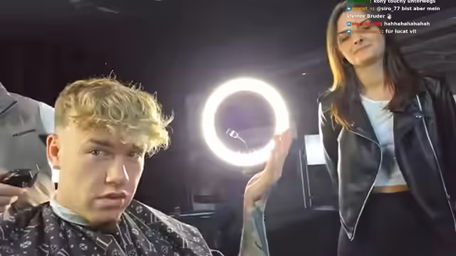 02:40:15Die Friseur-Session geht weiter mit kreativen Elementen. Es wird ein 'Eyeball Cut' vorgenommen, den der Streamer als ultimativen Superstar-Look bezeichnet. Es werden mehrfach verschiedene Rap-Einlagen gemacht, bei denen Phrasen wie 'fade with the chalk' und 'open up my jury box' wiederholt werden. Der Streamer zeigt sich hocherfreut über das Ergebnis des Haarschnitts.