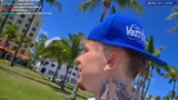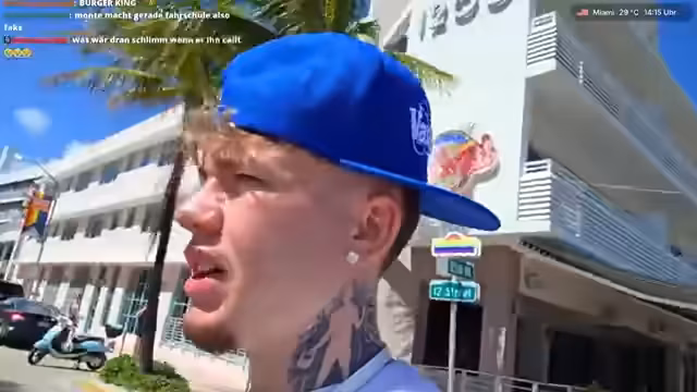 00:14:00Auf dem Ocean Drive spricht der Streamer gezielt Passanten an und unterhält sich mit ihnen. Er stellt sich als Kony Gaboni vor, einen Streamer aus Deutschland, und holt Selfies mit den Leuten, die er für 'top' und 'geil' hält. Dabei betont er immer wieder seinen Status als Star und vergleicht sich mit Prominenten wie Drake, was er als sein Ziel darstellt. Er versucht, die Aufmerksamkeit der Passanten auf sich zu lenken, um seine Präsenz zu zeigen und Content für seine Follower zu schaffen.
