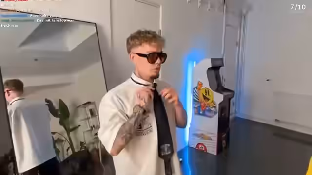 02:18:40Der Stream beginnt im sogenannten 'Ankleiderraum' von Sami, der als eingerichteter Styling-Bereich fungiert. Der Raum wird als sehr aufgeräumt und professionell beschrieben, im Gegensatz zum privaten Zimmer, bei dem alles auf dem Boden liege. Der Streamer präsentiert einige seiner Lieblingsstücke, wie eine Dieseljacke und eine Akronym-Jacke, und erklärt, dass er derzeit in einer anderen ästhetischen Bubble unterwegs sei als früher, in der er solche Teile gefeiert hätte.