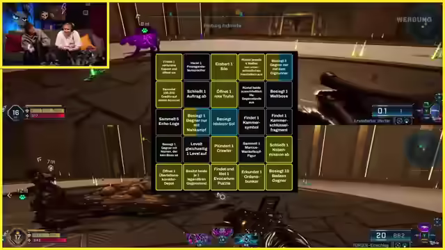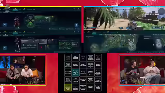00:22:14Das Team startet das Spiel mit einigen anfänglichen Spannungen und Neckereien. Es wird ein Überlebensdepot gefunden, was den ersten Bingo-Punkt einbringt. Die Beute wird aufgeteilt, und es wird nach einem Markus-Wackel-Kopf gesucht. Durch das Ausrüsten von vier Waffen verschiedener Hersteller wird ein weiteres Bingo-Feld abgeschlossen. Die nächste Aufgabe ist das Evokarium-Puzzle, während parallel versucht wird, Gegner mit dem Digi-Runner zu besiegen und Badass-Gegner zu erledigen. Es gibt Diskussionen über die Aufteilung der Aufgaben, wobei ein Streamer sich um das Puzzle kümmert und der andere Gegner jagt. Fünf Gegner werden im Nahkampf besiegt, was eine weitere Bingo-Aufgabe erfüllt. Es wird festgestellt, dass das Evokarium-Puzzle nun auch auf der Karte sichtbar ist. Während ein Streamer das Puzzle angeht, versucht der andere, Gegner mit dem Digi-Runner zu töten. Die nächste Mission ist Idolator Sol, und die Streamer diskutieren über den Weg dorthin. Fünf Digi-Runner-Kills werden erreicht. Ein Teleporter wird genutzt, um sich fortzubewegen. Das Evokarium-Puzzle wird erfolgreich abgeschlossen. Es folgt ein schwieriger Parkour-Abschnitt, und die Streamer helfen sich gegenseitig. Es wird über die Steuerung und Heilung im Spiel gesprochen. Ein Badass-Gegner wird erledigt, und es wird überlegt, welche Aufgaben als Nächstes angegangen werden sollen.