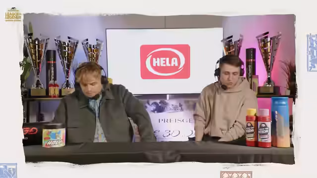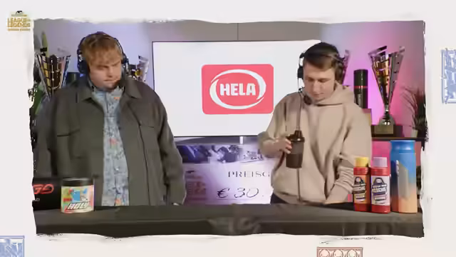 03:01:55Nach dem Interview wird eine wichtige Regel für die Teams bekannt gegeben: Der Draft darf erst gestartet werden, wenn der Main-Broadcast den Start signalisiert, um unnötige Pausen zu vermeiden. Anschließend wird ein Gewinnspiel für die Zuschauer angekündigt, bei dem ein Jahresvorrat Hela Ketchup verlost wird. Die Teilnahme erfolgt durch Eingabe von 'Hela' in den Chat. Während des Gewinnspiels wird ein 'Hela-Shot' mit scharfem Ketchup probiert und humorvoll kommentiert. Der scharfe Ketchup namens 'Günter' wird als überraschend intensiv beschrieben. Das Gewinnspiel wird aufgelöst und der Gewinner 'Reverse Scenario' bekannt gegeben. Es wird eine kurze Pause angekündigt, in der Highlights aus vergangenen Spielen gezeigt werden.