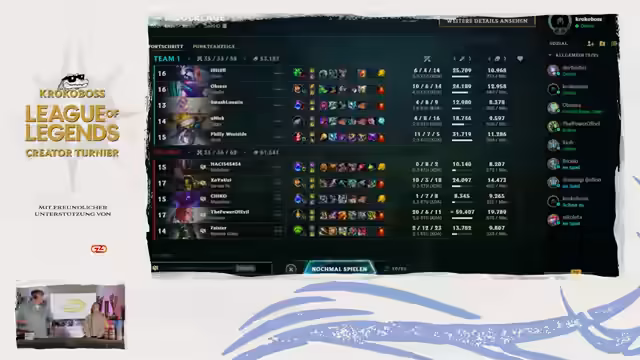 07:27:05Die Kommentatoren diskutieren die Schwierigkeit, das Spiel noch zu gewinnen, und sehen die Notwendigkeit einer Chef-Strobl-Masterclass. Obsess wird für seine Fähigkeit gelobt, das Spiel auch für die Gegner gewinnbar zu machen. Chef Strobls CS-Vorsprung auf Sylas wird erwähnt, aber auch, dass Maxim mit Shen mithält. Ein Toplane-Gank von Chef Strobl mit seiner Ult wird als entscheidend angesehen, aber Matzes Yi stirbt erneut. Kutscher zeigt beeindruckende Plays und versucht, das Double Kill zu sichern. Ein Botlane-Dive und ein gutes Cross-Map-Play werden hervorgehoben. Obsess wird für seine aggressive Spielweise kritisiert, insbesondere für das Starten des Drakes ohne Smite, was zu einem potenziellen Baron-Steal führen könnte. Chef Strobls Toplane-Tower bleibt intakt, aber Nick Beats' W und Ult auf Brücki führen zu einem Tilt. Brücki ist frustriert und mutet sich. Obsess' Fähigkeit, Catelyn zu töten, ohne zu flashen, wird als unfair empfunden. Ein weiterer Teamfight führt zu einem One-Shot von Kutscher, und es wird spekuliert, ob ein FF (Forfeit) kommen wird. Daniel Brückmann wird als erster genannt, der den Surrender-Knopf drücken würde. Nick Bitt gewinnt das Spiel mit seinem Jammern, was die Kommentatoren amüsiert. Es wird über weitere Spiele gesprochen, insbesondere über ein potenzielles Spiel mit "Entity's Sauer". Ein weiteres Spiel zwischen "Schuld und Sühne" und "Vier Engeln für Maxi" wird analysiert, wobei "Vier Engeln für Maxi" mit einer beeindruckenden 17-7-Führung überrascht. Die Kommentatoren loben die Camille-Performance und den guten Draft von "Vier Engeln für Maxi", der auf Dive-Kompositionen setzt. Die mentale Stärke des Teams wird hervorgehoben, und es wird spekuliert, dass eine Motivationsrede von Windy zum Erfolg beigetragen haben könnte. Die Rolle von Sarah und Nocturne im Teamfight wird analysiert, und es wird betont, dass Camille-Ultis auf Zeri oder Orianna eingesetzt werden sollten, um die Carry-Champions auszuschalten. Ein weiterer Catch führt zu einem hohen Schaden, aber es reicht nicht aus, um Alex zu töten. Ein Replay zeigt eine 3-Mann-Schockwelle von Orianna, die das Spiel entscheidet.