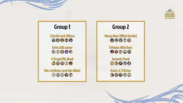 00:28:27Die zweite Gruppe des Turniers wird vorgestellt, beginnend mit Team "Many-Man (Wish-Dev) 1950s Soul-Version", bestehend aus Henki, Hassib, Nicoletta, Zola und Kiba. Henki wird als "The Korean Orn" und treuer Toplaner gelobt, während Hassib humorvoll als individuell schlechtester Spieler des Turniers bezeichnet wird, der jedoch auf der Midlane als "Espresso-Maschinen-Bodensatz" einen Mehrwert liefern könnte. Nicoletta wird im Jungle auf Amumu erwartet, und die Botlane Sola und Kiba wird als eine der besten des Turniers eingeschätzt. Weiter geht es mit Team "Grimms Märchen", bestehend aus Two Stone, Matze, Bröki, Lya und Chef Strobel. Chef Strobel wird als Illaoi-Spieler gefeiert, und es wird ein potenzielles Matchup gegen Hachi auf der Toplane thematisiert. Two Stone wird als wertvolles Teamelement beschrieben, das nicht leicht tiltet, während Bröki als jemand dargestellt wird, der sich sehr um die Anfänger in seinem Team kümmert. Matze auf Master Yi und Lya als treuer Support runden das Team ab. Abschließend wird Team "Jurassic Park" mit Maxim, Kutscher, Obsess, Nickbit und Smash Lunatic vorgestellt. Maxims Champion-Pool wird geheim gehalten, um keine Bans zu provozieren, und Kutschers Wunsch, Midlane zu spielen, wird erwähnt. Obsess wird als "Müllspieler" bezeichnet, dessen Motivation vom Hass auf gegnerische Teams abhängt, während Smash Lunatic für ihr Competitive Mindset aus PUBG gelobt wird. Die Kommentatoren gehen dann auf die Turnierstruktur ein: Vier Spiele laufen parallel, jedes Team spielt sechs Games in Hin- und Rückrunde. Die ersten beiden Teams jeder Gruppe kommen ins Upper Bracket (20.000€ Preispool), die unteren beiden ins Lower Bracket (10.000€ Preispool), um allen Teams eine Gewinnchance zu ermöglichen.