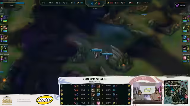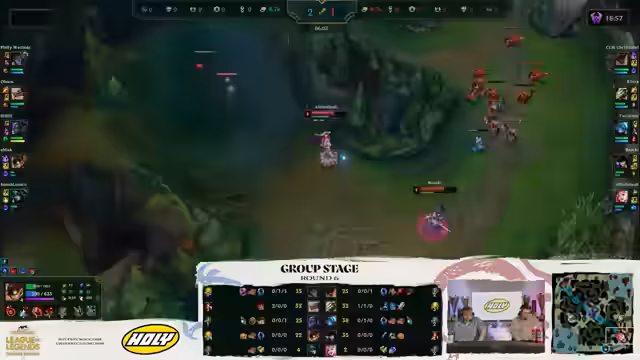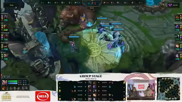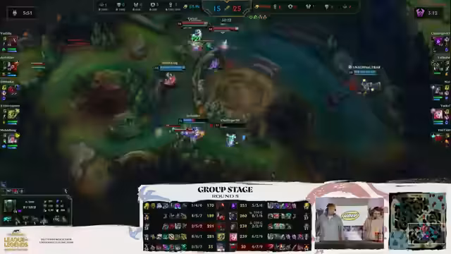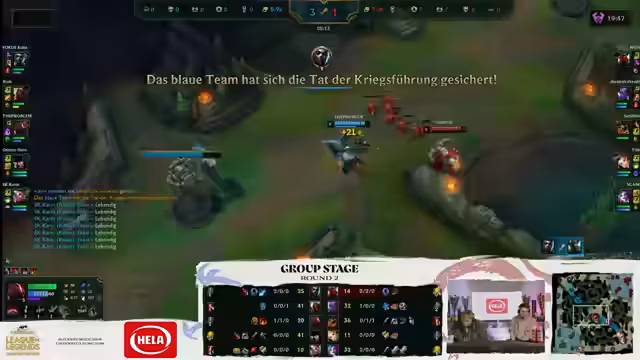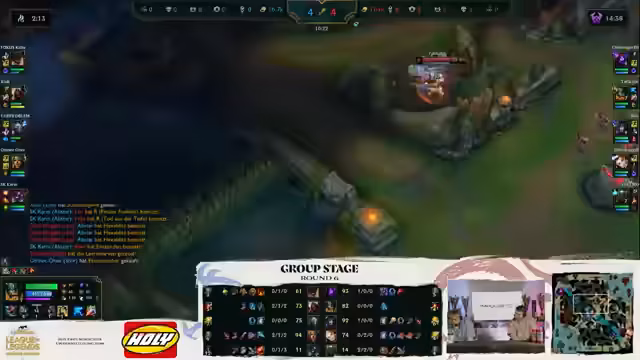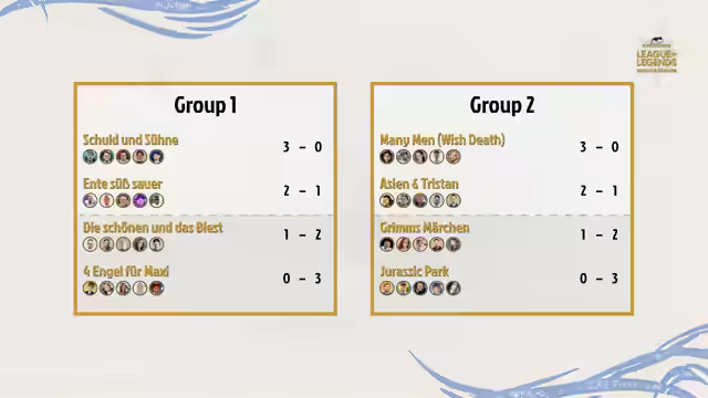 05:46:35Es fehlen noch zwei Spieler für das nächste Spiel, "Ente süß-sauer" gegen "Die Schönen und das Biest". Die Standings der Gruppenphase werden analysiert. In Gruppe 1 liegen "Ente Süß-Sauer" und "Schuld und Sühne" mit jeweils 3:1 Siegen gleichauf, was die Spannung aufrechterhält. "4 Engel für Maxi" scheint bereits im Loser-Bracket zu sein, was jedoch nicht als schlimm empfunden wird, da auch dort Preisgelder winken. In Gruppe 2 übertreffen "Many Men" die Erwartungen, insbesondere durch die Leistungen von Hanky auf der Toplane und Nicoletta mit ihrem Amumu-Pick. "Arsien und Tristan" kämpfen, obwohl "Power of Evil" gut spielt, kann er das Team nicht allein tragen. "Grimms Märchen" und "Jurassic Park" liegen bei 1:3, aber es wird angenommen, dass in dieser Gruppe noch alles offen ist, außer für "4 Engel für Maxi", die als sichere Kandidaten für das Lower Bracket gelten. Nach dem letzten Spiel des Tages sollen noch einmal die Highlights und Clips gezeigt werden.