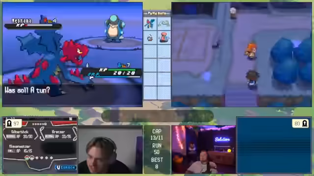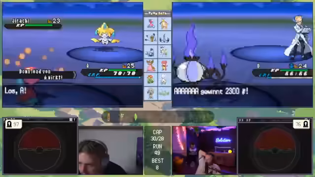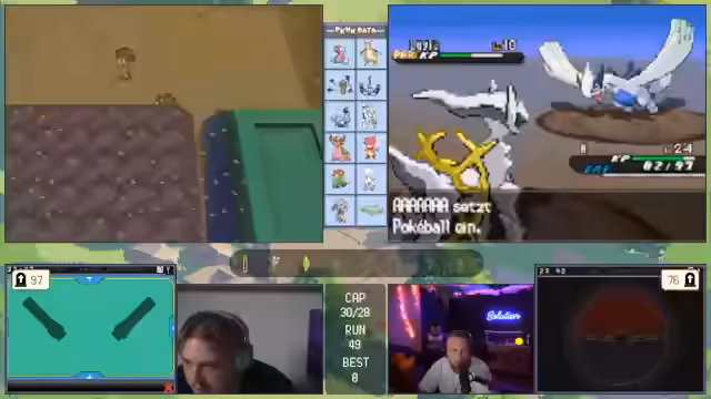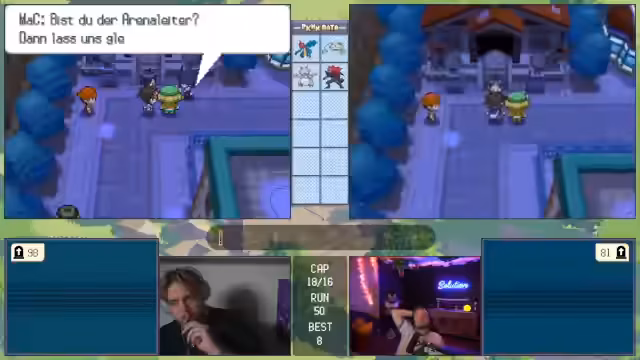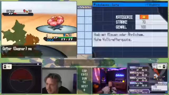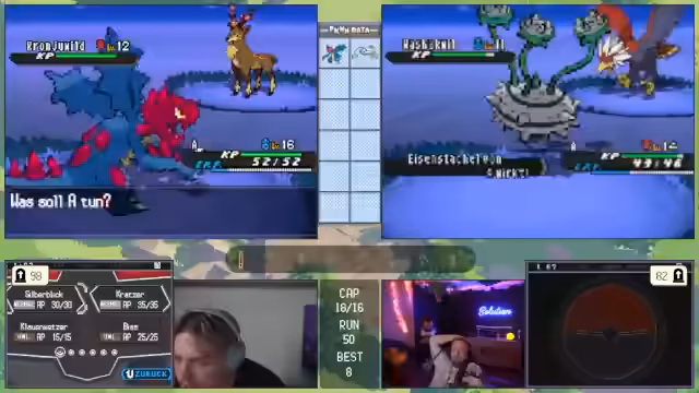00:41:21Ein Großteil des Streams ist von Live-Gameplay geprägt. Der Streamer stellt sein aktuelles Pokémon-Team vor und erläutert seine Strategie, wie etwa den Einsatz von Status-Items und Movesets. Er ist auf der Suche nach spezifischen Items wie Top-Schutz und sammelt Bälle. Während eines Kampfes gerät er in eine prekäre Situation, muss aber durch geschicktes Switching und den Einsatz von Schutzschild und Nachtschatten das Pokémon besiegen. Der Sieg wird als 'exzellent gespielt' gefeiert und seine Freude über einen erfolgreichen Run ist spürbar.