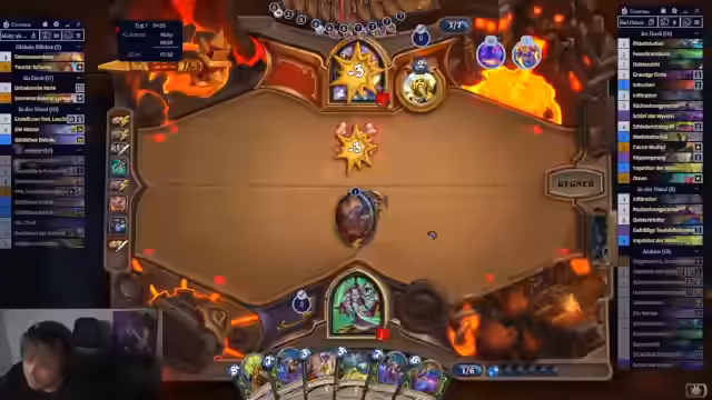 11:19:58Die Konzentration liegt auf einem spezifischen strategischen Zug, bei dem der Gegner einen 'freundlichen Fifty-Fifty' macht und der Streamer überlegt, ob er einen 'verrückten Zug' machen soll. Es geht um den Einsatz von Karten wie dem 'Himmels-Archiv' und dem 'Silly-Ax', wobei der Streamer versucht, dem Gegner mit dessen eigenen Waffen zu schlagen, was zu einer spannenden, aber auch frustrierenden Situation führt.