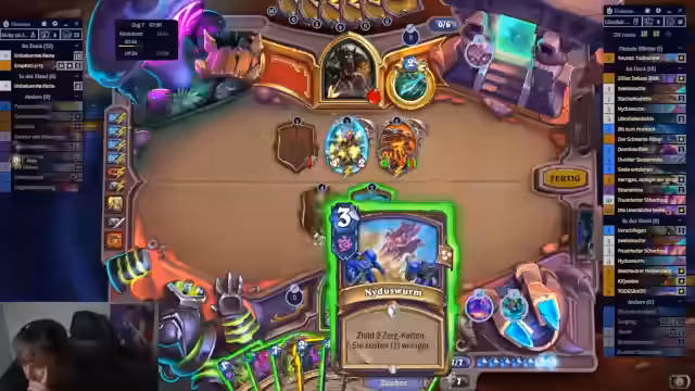 09:40:32Die Streamer beginnen ein Hearthstone-Duell mit einem StarCraft-Thema, bei dem beide Spieler tief in die Mechaniken des Spiels eintauchen. Es gibt eine Vielzahl von Decks und Spielzügen, die diskutiert werden, darunter Terraner und Demon Hunter. Das Spiel ist voller strategischer Tiefschläge, unerwarteter Züge und entscheidender Karten, die das Ergebnis des Spiels beeinflussen. Der Streamer zeigt eine hohe Bewunderung für den Gegner und den gesamten Spielstil.