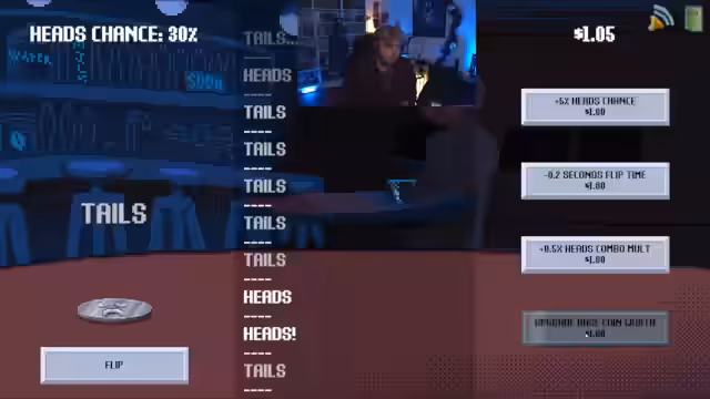 00:09:27Nachdem die technische Zusammenarbeit nicht wie gewünscht funktioniert, widmen sich Krokoboss und Kevin dem Spiel 'Rockbottom', einem Glücksspiel. Das Ziel ist es, zehnmal hintereinander 'Kopf' zu werfen. Sie nutzen durch Spenden im Chat verdientes Geld, um die Gewinnwahrscheinlichkeit durch Upgrades wie eine 5% höhere Chance oder schnellere Flips zu verbessern. Die Sprache ist von hoher Energie und Motivation geprägt, um das Ziel zu erreichen.