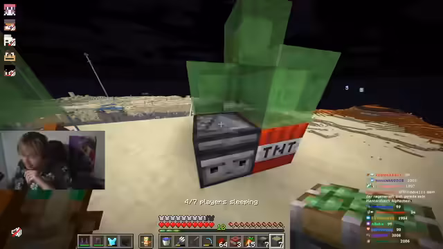 04:14:08Bei der Planung der Sprengung ergeben sich technische Probleme und Diskussionen über den Umfang. Man plant zunächst, eine 200x200 große Fläche zu sprengen, entscheidet sich aber, dies auf 196x196 zu reduzieren, um Zeit zu sparen. Die Sprengung soll gezielt nur an den Seiten erfolgen, während die obere und untere Ebene manuell bearbeitet werden muss. Ein großes Problem ist die Nähe von wichtigen Farmen zur Sprengung, wie der Bone-Meal-Farm, die durch herumfliegendes TNT oder Wasser beschädigt werden könnte.