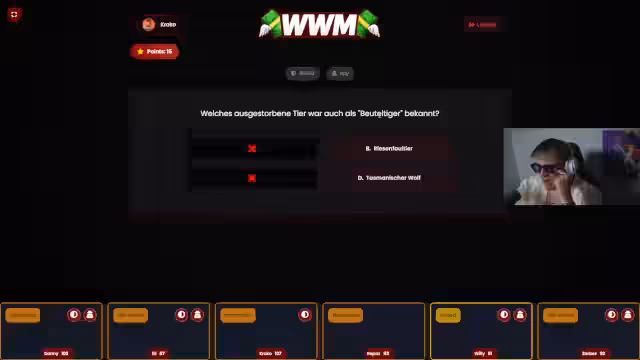 00:13:37Das erste Quizformat der Nacht sind die 'Buzzer Games', bei denen die Teilnehmer Bilder aus verschiedenen Kategorien so schnell wie möglich erkennen müssen. Ein Countdown und ein Balken sorgen für Zeitdruck. Für jede richtige Antwort gibt es drei Punkte, bei einer falschen Antwort einen Punkt Abzug. Während der ersten Ragen fällt auf, dass einige Teilnehmer sehr gute Reflexe und 'Augenkoordination' haben. Es kommt zu hitzigen Diskussionen über die Richtigkeit von Antworten und die Auswertung, die den Ton des Streams prägt.