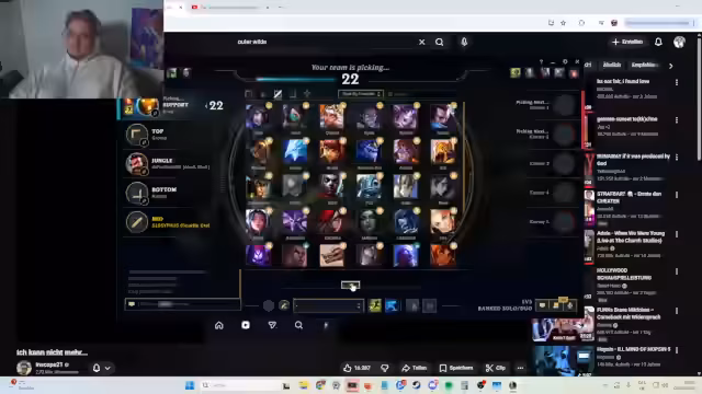 01:35:33Der Stream konzentriert sich auf ein intensives League of Legends-Spiel. KrokoBoss spielt die Champions Nasus und Nidalee und analysiert seine Items, wie Rod of Ages und Frozen Heart, und die gegnerischen Comps. Er beschreibt seine Farm-Strategie, Teamkämpfe und Entscheidungen, wie das Solo-Roten, wobei er seine Taktiken und Frustrationen im Chat teilt und von der 'Blutlord'-Playlist erzählt, die ihm die richtige Stimmung für das Spiel gibt.