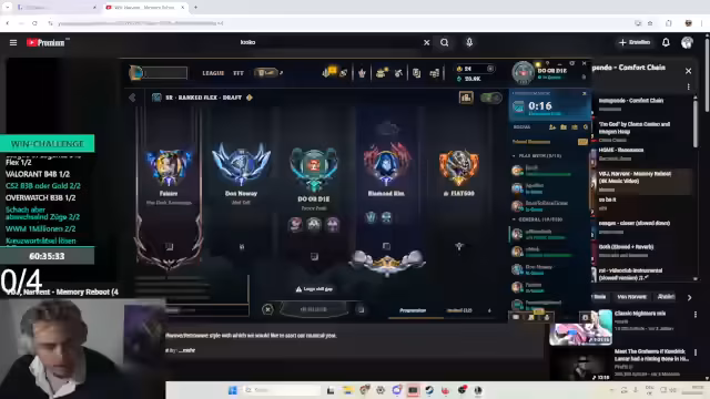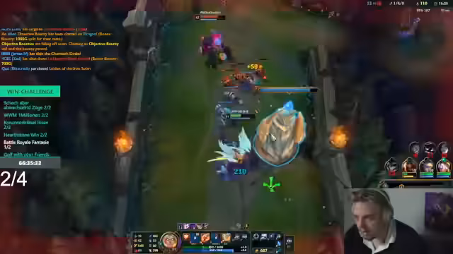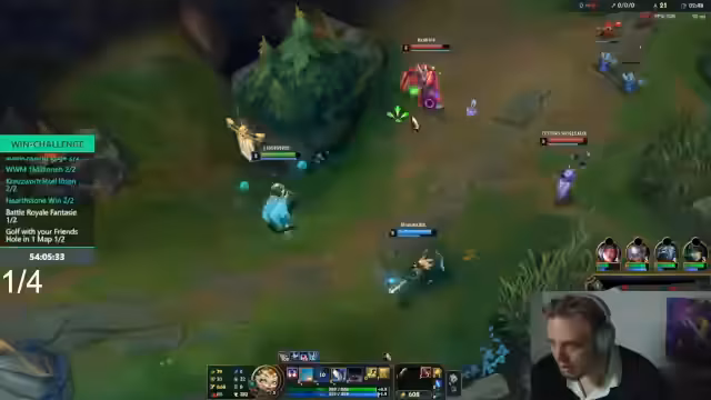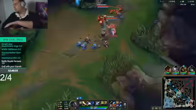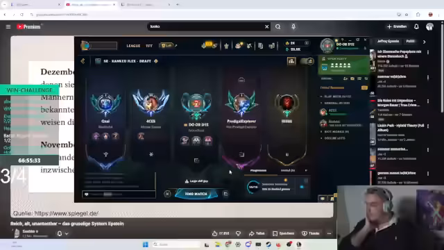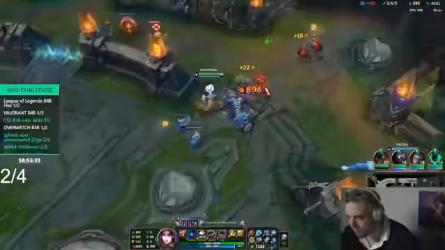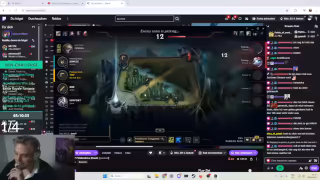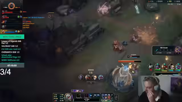 00:14:03Der Fokus verlagert sich auf ein League of Legends-Spiel. Der Streamer und sein Team, bestehend aus Willi und Sascha, koordinieren ihre Rollen, wobei der Streamer den Jungle übernimmt. Es kommt zu Missverständnissen und Diskussionen im Chat, insbesondere über die Leistung von Top-Lane-Spieler Willi. Der Streamer gibt Anweisungen und versucht, das Team zu motivieren, während die Stimmung im Spiel zwischen Begeisterung und Frustration schwankt.