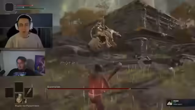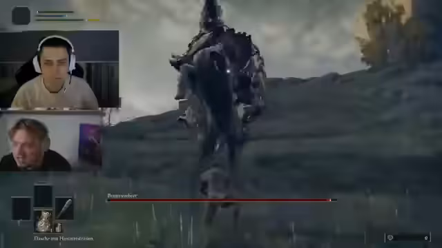 01:09:55Der Stream startet direkt im Spiel Elden Ring. Nach anfänglicher Verwirrung über die Steuerung und Grafik wird der erste Bosskampf, der 'Baumwächter' (Tree Sentinel), begonnen. Kommentiert wird der Kampf intensiv, wobei die Mechaniken des Ausweichens (Dodging), der Attacken-Fenster und die Notwendigkeit, das Moveset des Gegners zu lernen, erklärt werden. Der Streamer erlitt dabei mehrere Tode, was als Lernprozess dargestellt wird.