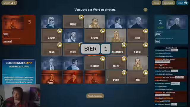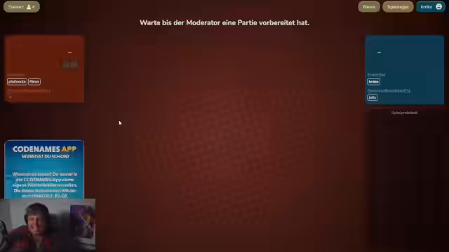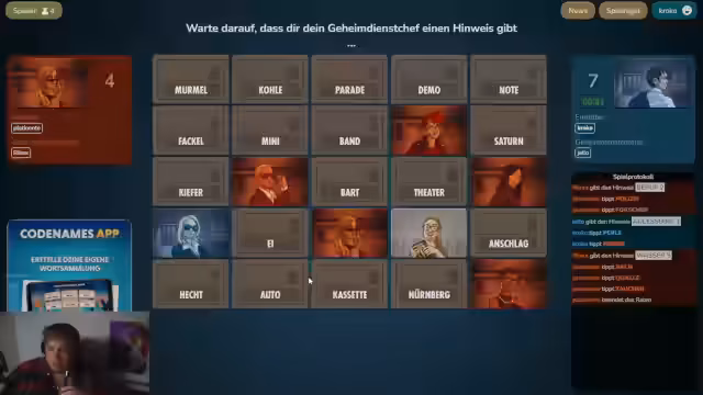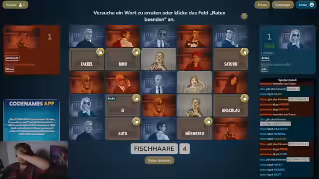 03:55:47Eine intensive Runde des Codenames-Spiels beginnt. Es geht um das Erraten der Begriffe 'Beruf' und 'Accessoires'. Der Streamer und Eli diskutieren verschiedene Möglichkeiten und Eliminierungen. Für 'Beruf' stehen Taucher und Forscher im Raum. Bei 'Accessoires' wird über Perlenketten, Ringe und den Begriff 'Murmel' spekuliert, die eventuell als Ball für das Theater dienen könnte. Es ist ein Kopf-an-Kopf-Rennen, bei dem der Streamer die Begriffe aktiv auf dem Schirm behält und versucht, Eli zur richtigen Antwort zu führen.