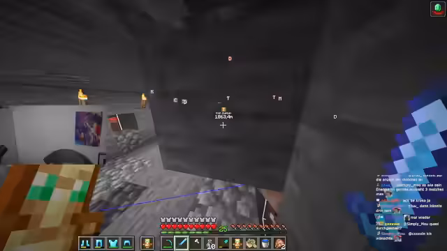 00:22:11Das Gameplay in Minecraft geht weiter, wird jedoch durch externe Unterbrechungen und persönliche Interaktionen getrübt. Der Streamer leitet seine Mitspieler an, eine neue, geheime Basis zu errichten und das Loch zu füllen, in welches der gegnerische Spieler gefallen ist. Es kommt zu technischen Schwierigkeiten wie dem Verlust der Position auf der Map und der Verwirrung über die genauen Koordinaten. Gleichzeitig tauchen neue Mitspieler im Stream auf, was die Komplexität der Koordination erhöht.