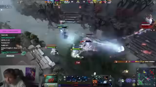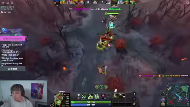 10:04:34Es wird festgestellt, dass die Botnet-Gegner betrügen und dass der Putsch und die Willows sehr gut spielen. Der Putsch stellt sich in den Wald und wirft seinen Hook über drei Kilometer. Es wird überlegt, wie man sich davor schützen kann, indem man den Wald wartet. Es wird eine Anekdote über einen Putsch erzählt, der von einer Autobahnraststätte zur nächsten gehuckt hat. Die Passive von Putsch, Axel Schweiß, wird erklärt, die den Gegner in Melee-Range betäubt und crittet. Es wird überlegt, wie man die Gegner umbringen kann, wobei der Fokus auf dem Witch Doctor liegt. Ein Spieler driftet in den Jungle ab, während andere farmen. Es wird vermutet, dass der Gigglerino im letzten Spiel besser ist als die aktuellen Spieler. Es wird überlegt, wie man das Spiel gewinnen kann, und es wird beschlossen, nicht zu kämpfen, sondern aufzupassen und sich gegenseitig zu helfen. Es wird über die Fähigkeiten der Gegner diskutiert, insbesondere die von Dark Willow, die squishy ist, aber verschwinden kann und viel Schaden macht.