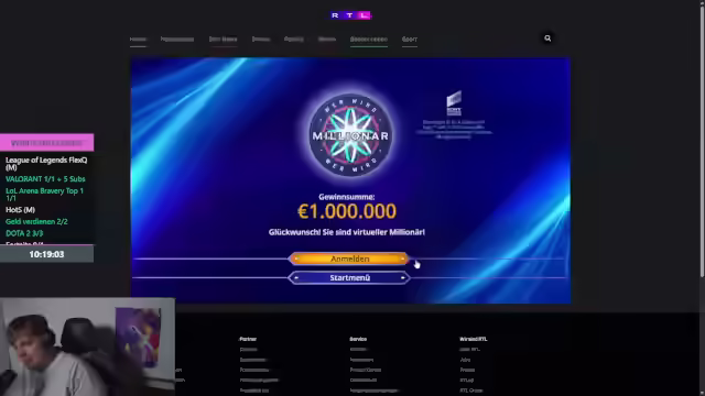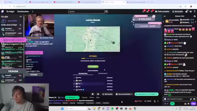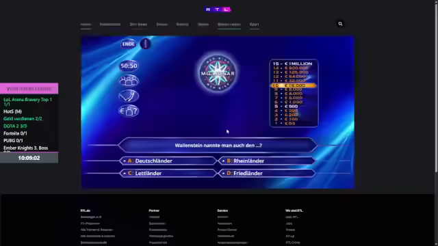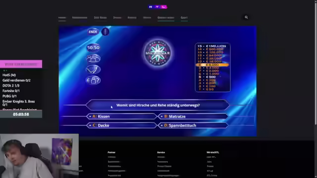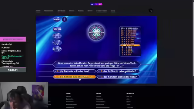 05:40:14Es wird erwähnt, dass mehrere Streamer, darunter auch Karni, an diesem Wochenende zu unterschiedlichen Zeiten ein Placement für das Spiel Akaron haben. Um die Stimmung aufzulockern, wird eine Runde 'Wer wird Millionär?' gespielt, bei der die Zuschauer über Discord teilnehmen können, um Verzögerungen zu vermeiden. Es werden verschiedene Fragen beantwortet, wobei die Teilnehmer ohne Joker spielen. Die Fragen reichen von Plattencovern aus dem Jahr 1985 bis hin zu deutschen Sprichwörtern und Konsumverhalten. Es wird über die Schwierigkeit einiger Fragen diskutiert und gerätselt, insbesondere bei einer 200-Euro-Frage zu einem deutschen Sprichwort. Die Gruppe versucht, gemeinsam die Antworten zu finden, wobei es zu Uneinigkeiten und lustigen Kommentaren kommt. Am Ende wird demokratisch entschieden, welche Antwort gewählt wird, was nicht immer zum gewünschten Erfolg führt. Es folgen weitere Fragen zu verschiedenen Themen, darunter Weinpreise und Kindersendungen.