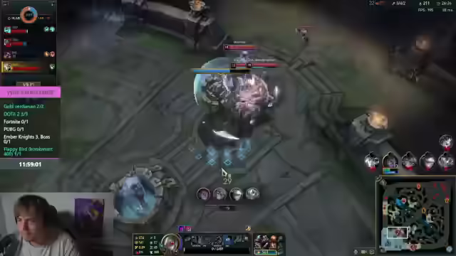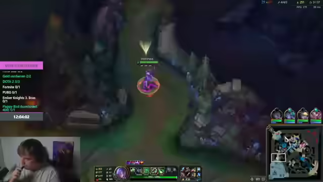 12:38:02Das Spielgeschehen gestaltet sich schwierig aufgrund der Teamzusammensetzung, die aus Burst-Champions besteht, welche gegen einen stark gefeedeten Mundo, Alistar und Jäker wenig ausrichten können. Es mangelt an Schaden, um Mundo effektiv zu bekämpfen, selbst im späteren Spielverlauf. Die Situation wird dadurch erschwert, dass Schlüsselmomente unglücklich verlaufen und wichtige Fähigkeiten wie Flash nicht zur Verfügung stehen. Trotzdem wird versucht, durch Teamkämpfe und das Ausnutzen von Überraschungsmomenten wie Flankierungen oder das Stehlen von Zielen wie dem Drachen, das Spielgeschehen zum eigenen Vorteil zu wenden. Es wird überlegt, ob der Fokus auf den Herold verlagert werden soll, während der Gegner den Drachen angreift. Die Notwendigkeit von Gegenständen wie Shojin's Rildos wird diskutiert, um den Schaden zu erhöhen und gegen die gegnerischen Tanks bestehen zu können. Es wird festgestellt, dass der Gegner den Drachen einnimmt und ein Timeout im Chat verhängt wird. Trotz einiger erfolgreicher Aktionen, wie dem Erwirken eines Kills durch einen Redemption Snipe, bleibt die Situation angespannt.