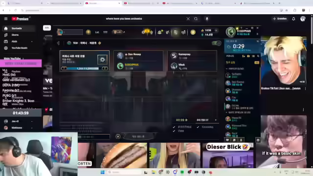 11:43:36Die Gruppe diskutierte, ob sie zuerst HOTS, League of Legends oder ein anderes Spiel spielen sollten. Schnell einigte man sich darauf, ein schnelles League of Legends-Spiel zu machen, um es von der Liste zu streichen. Die Vorfreude auf das Spiel mit Kali auf der Botlane war groß, und es herrschte Zuversicht, dass sie kein League of Legends-Spiel verlieren würden, da alles andere als peinlich angesehen wurde. Allerdings äußerte man Bedenken hinsichtlich PUBG und Fortnite, da man sich dort weniger erfahren fühlte. Es wurde erwähnt, dass Kroko in diesen Spielen jedoch stark sei. Die Gruppe versuchte, Kroko in die Freundesliste einzuladen, um mit dem Spiel zu beginnen. Währenddessen wurde kurz überlegt, eine Toilettenpause einzulegen, aber beschlossen, dies zu verschieben. Es wurde die Möglichkeit erwähnt, dass sie das Ziel erreichen könnten, bevor sie schlafen gehen, aber es wurde auch eingeräumt, dass es schwer vorherzusagen ist und sie möglicherweise noch lange spielen müssen. PUBG wurde als entweder sehr einfach oder unmöglich beschrieben, abhängig davon, wie gut die Lobbys sind. Es wurde die Strategie erwähnt, die Lobbys so herunterzuziehen, dass sie dem eigenen Account entsprechen, um in einfachere Spiele zu gelangen. Es wurde jedoch auch das Problem von 'Schützern' in den Spielen angesprochen, die eine Herausforderung darstellen könnten.