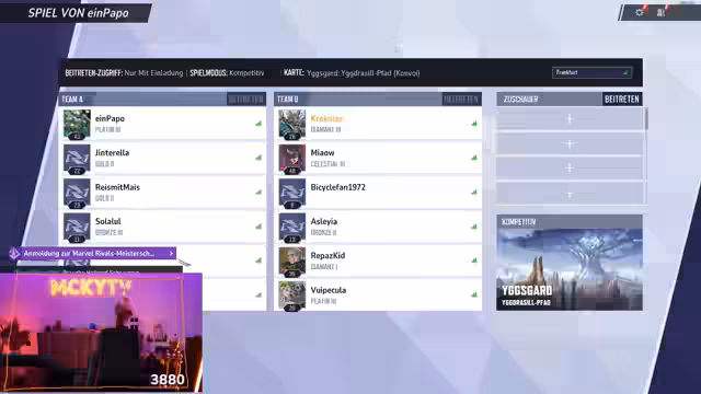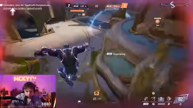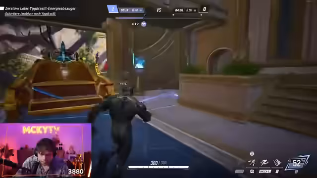 03:02:15Auf der Map Iggdrasil werden die Kämpfe nun offiziell im Best-of-3-Modus fortgesetzt. Das Team greift als Angreifer an. Der Streamer, der als Black Panther spielt, fordert seine Mitspieler auf, zusammenzuhalten und einen gezielten Anzug auf die Healer der Gegner zu starten. Trotz guter Taktiken und strategischem Vorgehen gelingt es dem Gegner, den Payload zu stoppen und wieder aufzuholen. Der Streamer kritisiert, dass zu wenige Teammitglieder zum Push vorstießen, was zu einer verpassten Gelegenheit führte.