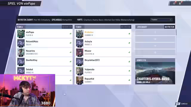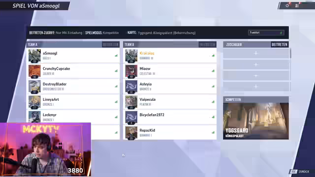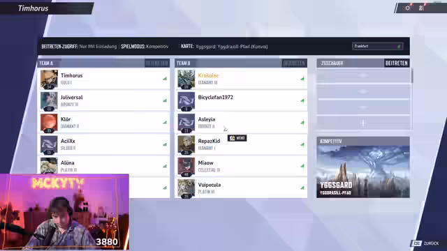 00:12:49Vor dem Turnier gibt es Probleme bei der Zusammenstellung der Teams. Ein Spieler namens Yushi ist zunächst nicht erreichbar, da er angeblich noch staubsaugt, und ein weiterer Spieler, Jenny, fehlt noch im Discord. Streamer wie Reep und Miau werden aufgrund ihrer angeblich furchtbaren Leistung kritisiert. Die Teamzusammenstellung ist chaotisch, da Spieler nicht immer als Freunde befreundet sind, um sie einladen zu können. Dennoch scheint das finale Team mit Bicycle-Fan 1972, Reep und Miau am Start zu stehen, um das Turnier zu beginnen.